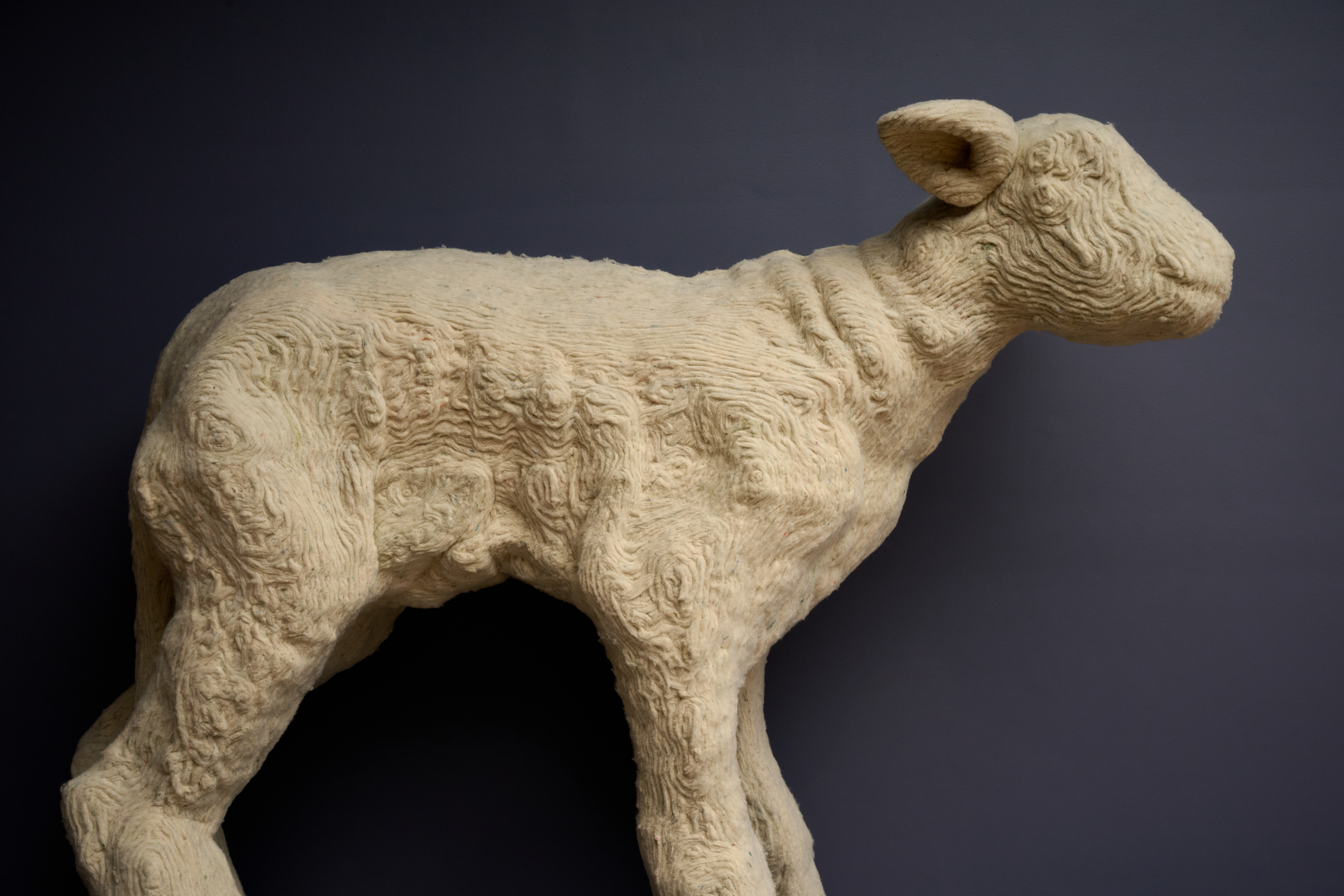 For the Commission presented at NGV Melbourne, Meindertsma presents a giant lamb constructed from European wool that would have otherwise been discarded as waste. First there was a mountain, 2024, utilises a robotic tool known as the ‘Wobot’, developed in collaboration with TFT Tools for Technology. Demonstrating the possibility of fabricating structural, three-dimensional objects using only wool, this project revolutionises the repurposing of wool and highlights its vast potential for future applications.